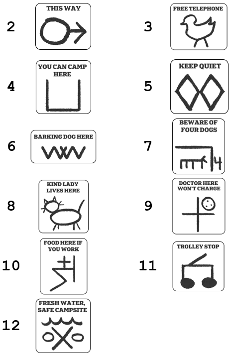 They wrote symbols on walls with a lump of coal, chalk, or even a sharp rock to tell other hoboes information that would help them and keep them safe. The symbols told them about the people they might meet and where to get food, water, and a good night’s sleep.